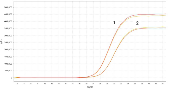 圖2. 同一份呼吸道拭子樣本,Taqman探針法檢測(cè)肺炎支原體, StarvioHC熱啟動(dòng)Taq酶(1)比知名品牌供應(yīng)商T熱啟動(dòng)DNA聚合酶(2)檢測(cè)結(jié)果早2個(gè)CT。
