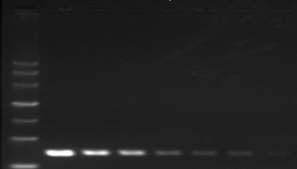 圖1. StarvioHC擴(kuò)增人IL-2基因, 泳道1為 DNA Marker,泳道2約為700 pg人基因組DNA,泳道3-7為 2倍系列稀釋后的擴(kuò)增片段。結(jié)果表明,StarvioHC具有特別高的檢測(cè)靈敏度,即使基因組DNA低到10 pg也能擴(kuò)增出目標(biāo)片段。