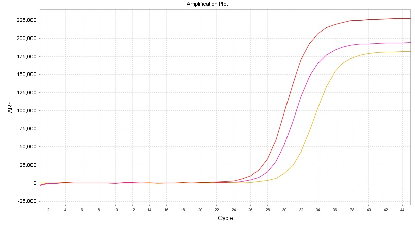 圖3. 使用StarvioHC檢測(cè)呼吸道病原體感染。1為內(nèi)參基因擴(kuò)增曲線,2為肺炎支原體擴(kuò)增曲線,3為呼吸道合胞病毒擴(kuò)增曲線,CT值分別為25.2、26.6、28.8。以上可見,StarvioHC具有擴(kuò)增曲線典型,酶動(dòng)力強(qiáng)勁,適合多重檢測(cè)等顯著優(yōu)點(diǎn)。