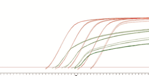 圖. 以人的總RNA為模板,10倍系列稀釋?zhuān)徊椒〝U(kuò)增ubiquitin基因的一個(gè)片段,每個(gè)反應(yīng)重復(fù)3次。紅線(xiàn)為Starvio一步染料法熒光定量PCR試劑盒的擴(kuò)增結(jié)果,綠線(xiàn)為國(guó)內(nèi)另一品牌供應(yīng)商的擴(kuò)增結(jié)果??梢?jiàn),Starvio一步染料法熒光定量PCR試劑盒反應(yīng)更為靈敏,線(xiàn)性范圍寬,穩(wěn)定性好。