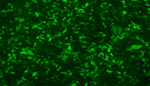 圖 Starvio 293 2.5μl轉(zhuǎn)染0.8μg pEGFP-C2質(zhì)粒到AAV-293細(xì)胞后,綠色熒光蛋白的表達(dá)情況