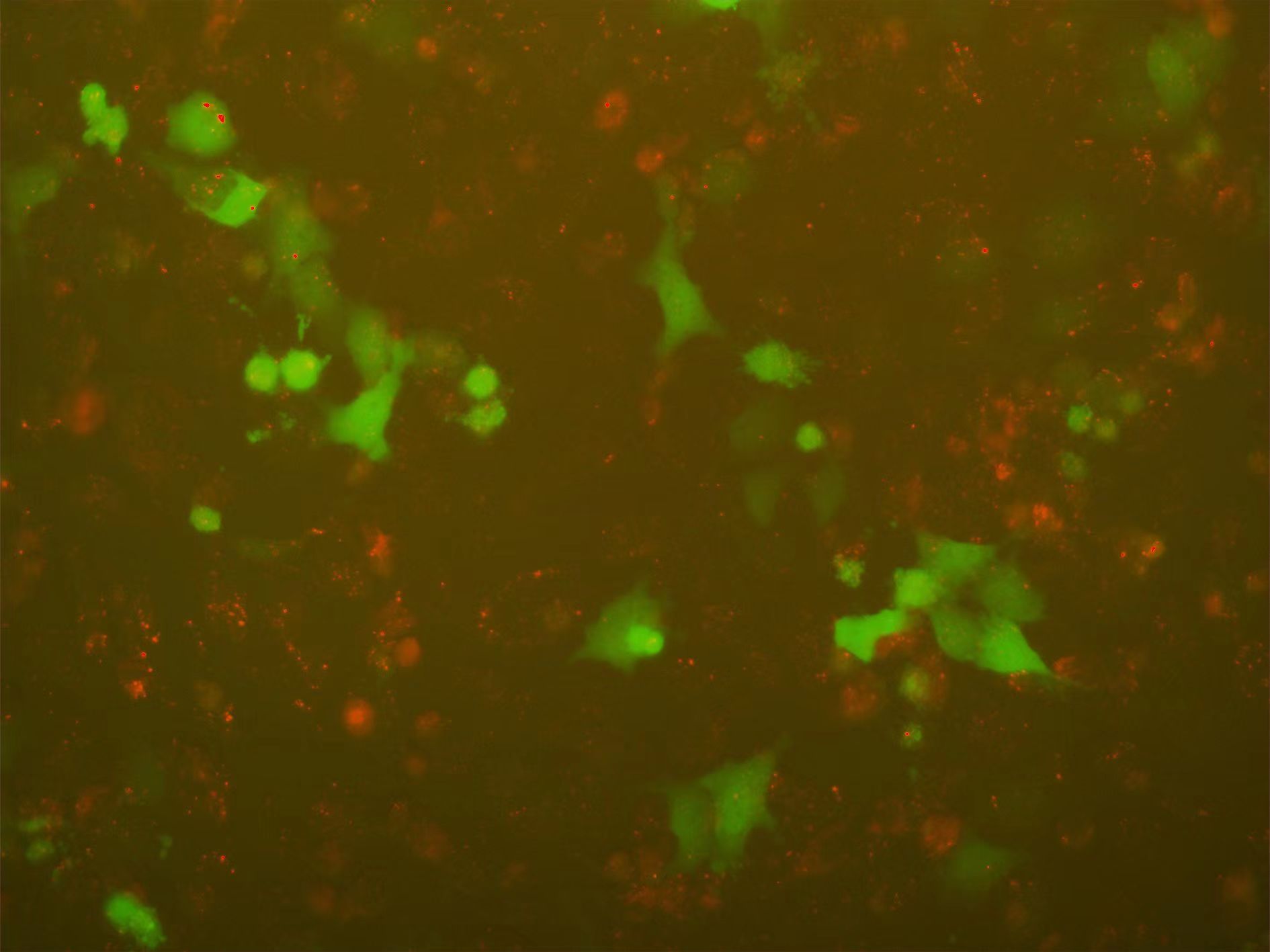 圖 StarvioCO DNA & siRNA同時將0.8ug EGFP質(zhì)粒和15pmol CY3-siRNA轉(zhuǎn)染入Hela細(xì)胞,24H