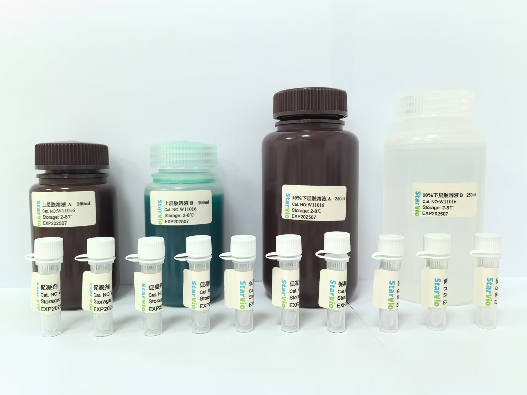 本產(chǎn)品采用星啟百代獨(dú)有的DonGel凝膠技術(shù),可在灌制下層膠后直接注入上層膠,實(shí)現(xiàn)一步法快速制膠,省去液封步驟。同時(shí),研究者不需要再計(jì)算各種成份的使用量,操作更加簡(jiǎn)單,大幅提高了研究者的制膠效率。特別地,使用本產(chǎn)品制備的凝膠,蛋白組份分離效果更好,條帶更加清晰銳利,并且,電泳分離時(shí)間較普通一步法配方顯著縮短。本產(chǎn)品上層膠溶液B中含有染料,使蛋白點(diǎn)樣孔清晰呈現(xiàn),研究者加樣更加方便。該染料可在上層膠中穩(wěn)定存在,不會(huì)隨著電泳遷移,不會(huì)影響電泳和染色效果,電泳完成后更加便于識(shí)別和切除,不會(huì)影響后續(xù)實(shí)驗(yàn)。本產(chǎn)品配套提供新型促凝劑,其具有更好的穩(wěn)定性,可于-20℃長(zhǎng)期保存,4℃保存至少三個(gè)月。本產(chǎn)品制備的凝膠不含SDS,也可以用于非變性PAGE凝膠電泳。
