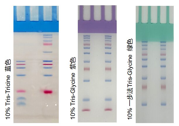 Starvio PAGE上層膠彩色染料由百代生物研發(fā)而成,是一種適用于配制彩色聚丙烯酰胺凝膠上層膠(又稱濃縮膠、堆積膠或積層膠)的水溶性染料,該染料有綠、藍(lán)、紫三種顏色可供選擇,便于研究者區(qū)分不同的凝膠。配膠過程中添加該染料可得到鮮艷透明的上層膠,使得蛋白點(diǎn)樣孔一目了然,同時(shí)也方便研究者判斷上樣孔邊距或上樣孔是否歪曲破損,方便將蛋白樣品準(zhǔn)確無誤地加入點(diǎn)樣孔中。該染料可以穩(wěn)定存在于上層膠中,不會(huì)隨著電泳進(jìn)入下層膠,因此該染料不會(huì)影響電泳和染色效果,電泳完成后也便于識(shí)別上層膠并切除,不影響后續(xù)實(shí)驗(yàn)。
