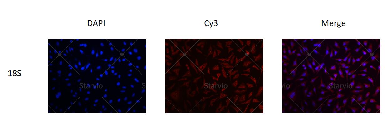 圖.使用Starvio Cy3標(biāo)記RNA探針合成試劑盒合成cy3-18S RNA,F(xiàn)ISH實(shí)驗(yàn)檢測(cè)Hela細(xì)胞中18S rRNA的定位。